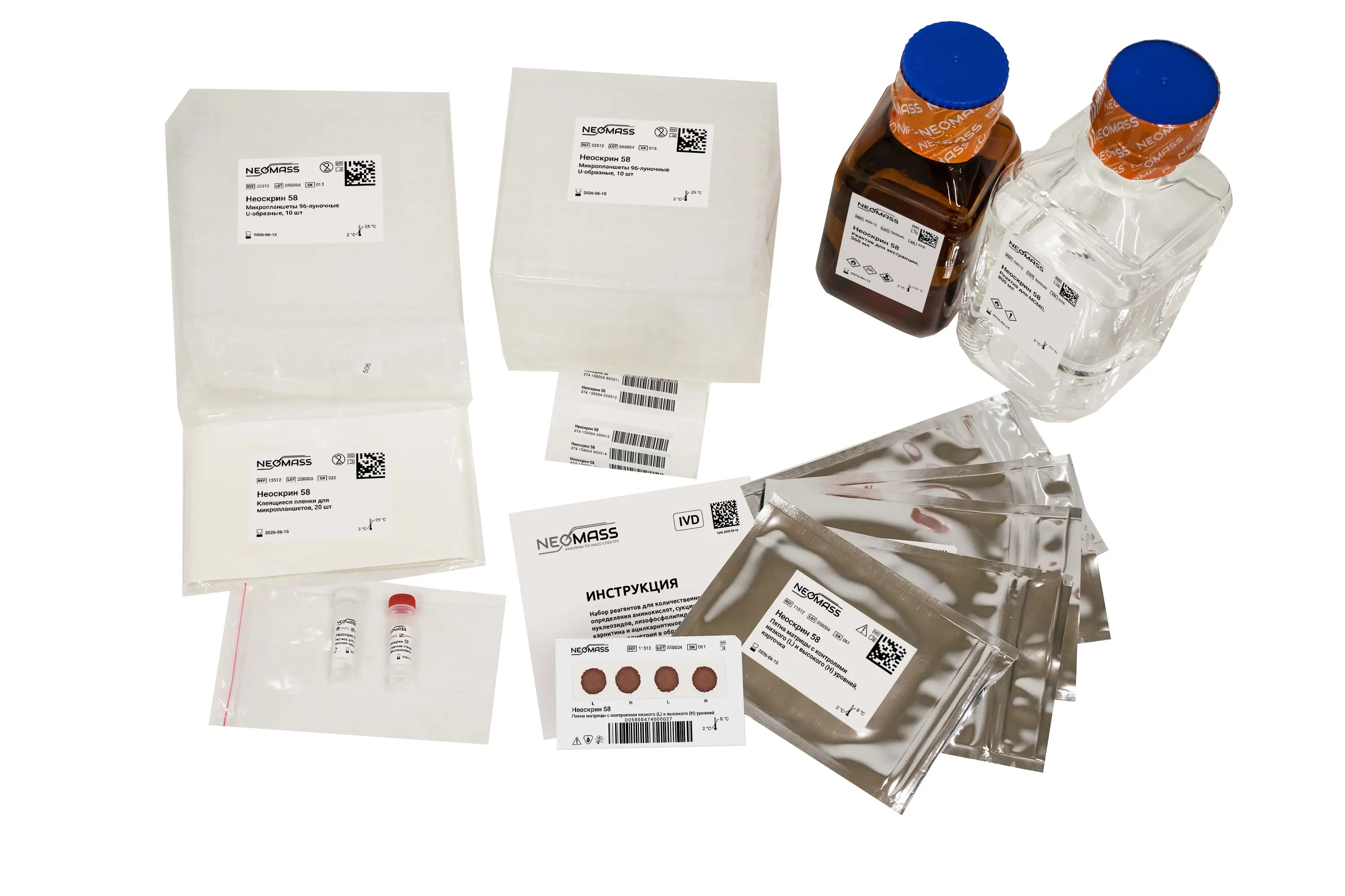 Набор реагентов предназначен для количественного определения аминокислот, сукцинилацетона, свободного карнитина и ацилкарнитинов методом тандемной масс-спектрометрии в образцах сухих пятен крови. Предназначен для профессионального применения в медицинских учреждениях и клинико-диагностических лабораториях.